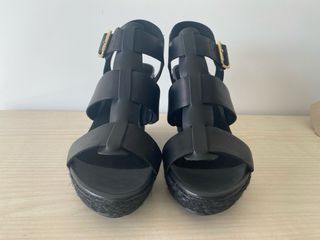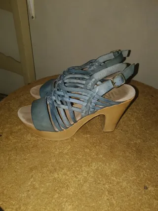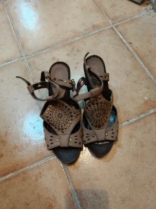 Sandalias de cuña de madera. - Material exterior de piel. - Cierre de tira al tobillo. - Diseño abierto. - Detalle de tachuelas. Detalles por el uso pero en buen estado, muy comodas