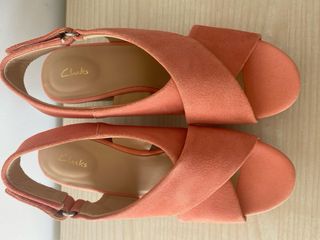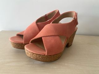 Sandalias de cuña Clarks modelo Maritsa Lara en color coral claro. Están nuevas, sin uso. Tienen cuña de corcho muy ligera y estable, con diseño cruzado que sujeta bien el pie y cierre ajustable en el talón. Son muy cómodas, típicas del confort de Clarks, ideales para verano porque combinan fácilmente con vestidos, faldas o vaqueros. Talla 38. Se entregan con su caja original.
