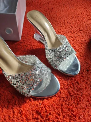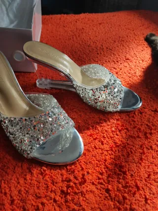 Elegantes sandalias plateadas con un diseño brillante. Perfectas para añadir un toque de glamour a cualquier atuendo. - Tira delantera adornada con pedrería. - Cuña transparente. - Diseño tipo mule abierto.