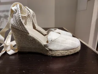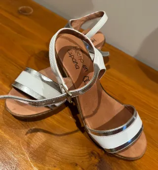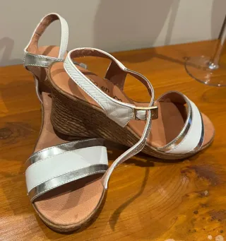 Sandalias de cuña con tiras en color blanco piel y detalle en dorado. La suela está forrada con esparto de plástico.De pie mide 23cm,el alto de la cuña 7cm y el de ala te 4,5cm.Marca Andares ce tienda catchalot.Estan puestas de unas horas.Las vendo porque me quedan grandes. Comodisimas. - Tira frontal en dorado. - Tira de tobillo en blanco. - Cierre de velcro.