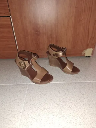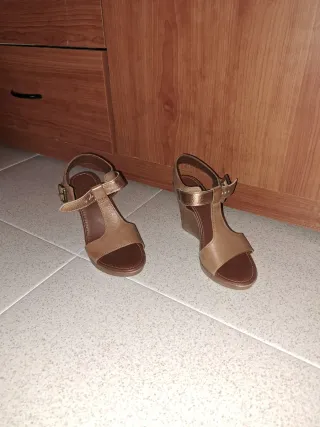 Sandalias de piel en color camel con detalles en dorado. Tacón tipo cuña para mayor comodidad. - Material exterior: Piel. - Material interior: Piel. - Cierre con hebilla. POCO USO. Si me valen pero ya no uso tanto tacón.