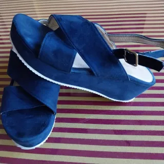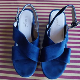 Sandalias de la marca Maryda en color azul y talla 38. Diseño cruzado en la pala y tira trasera con hebilla. - Pala con tiras cruzadas. - Tira trasera ajustable con hebilla. - Suela de cuña.