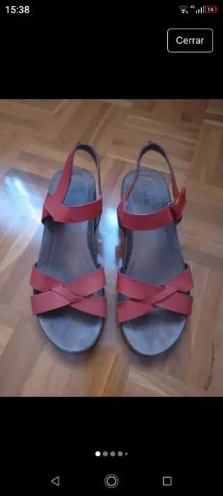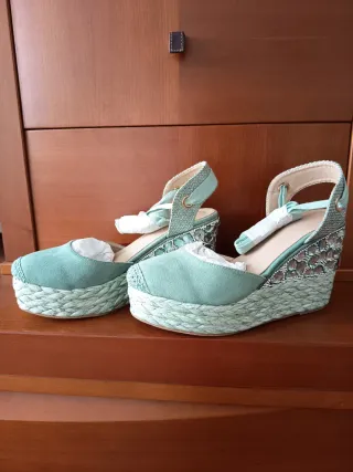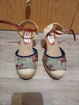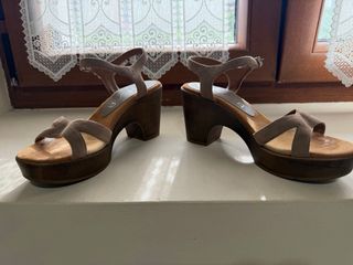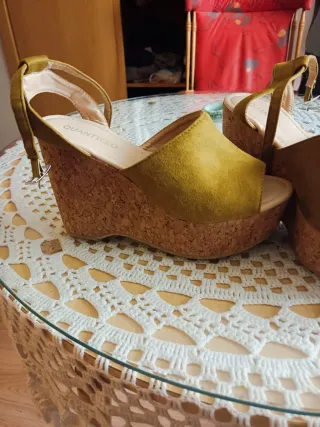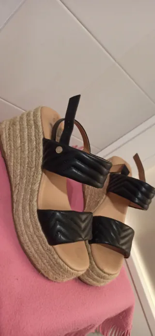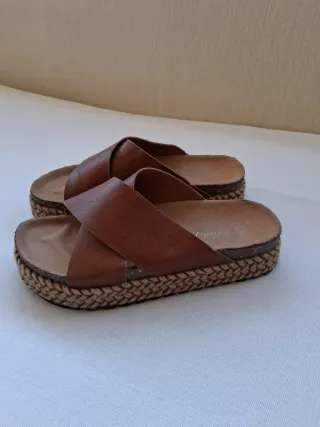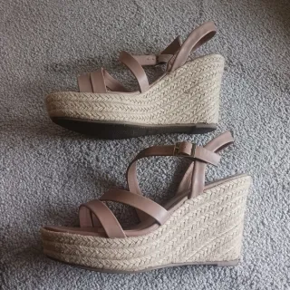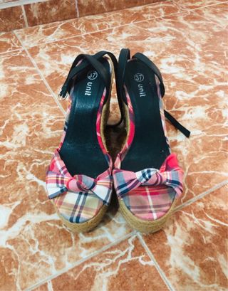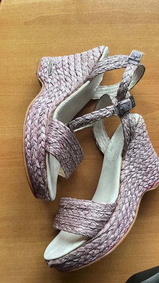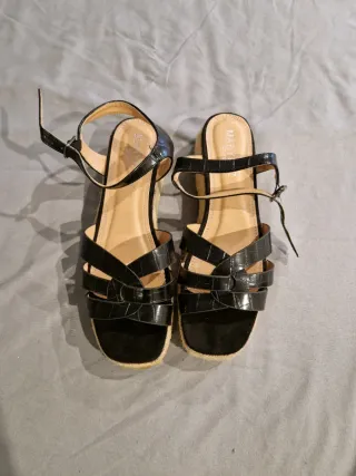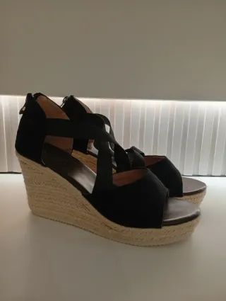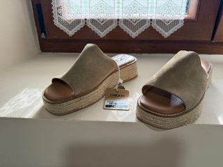 Sandalias de plataforma con un diseño de cuña y tiras. - Material exterior de ante. - Cierre con hebilla. - Suela de esparto. No pone talla pero yo suelo usar la 38 en sandalias y 39 en calzado cerrado. Por eso he puesto 38.5. Usadas 3-4 veces. Urge venta.