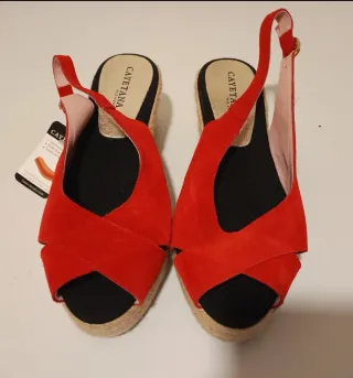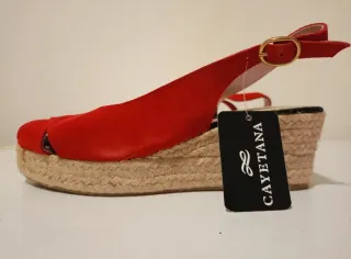 alpargatas de la marca española Cayetana en color rojo vibrante. ¡Nuevas a estrenar con etiqueta! Plantilla de gel incorporada (muy cómodas para aguantar horas). Plataforma de yute natural. Cierre con hebilla dorada al tobillo.