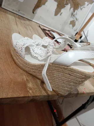 Cuñas de la marca Charo Ruiz con un diseño de puntilla, color blanco. Talla 37. Muy cómodas, ideal para boda. - Material exterior de puntilla. - Plataforma de esparto. - Puestas solo una vez.