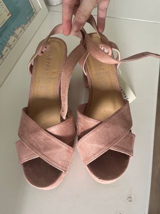 Sandalias de cuña con tiras y atadas al tobillo. - Diseño de tiras finas. - Cierre con hebilla. - Plataforma con acabado de esparto. - Nuevas - Precio original 29,99€