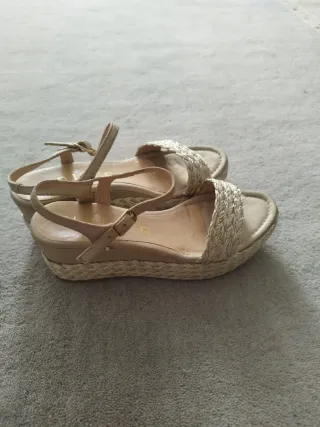 Sandalias de cuña con un diseño elegante y moderno. Vendo porque no uso, están en perfectas condiciones. Como nuevas. Son talla 37. Yo uso la 36 y me equivoqué. Entrego en metro badal de Sants o envío. - Material exterior dorado. - Tira delantera trenzada. - Cierre de hebilla ajustable.