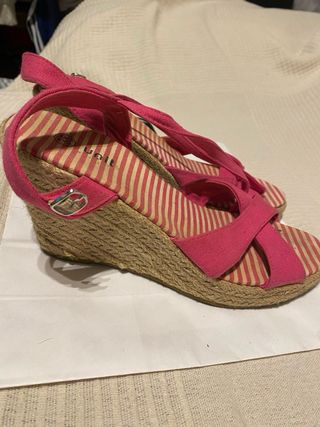 Sandalias de cuña Tommy Hilfiger, puestas solo una vez. - Color azul marino con detalles en rojo y blanco. - Plataforma de esparto. - Tira ajustable al tobillo.