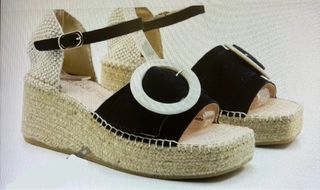Sandalias de cuña con un diseño moderno y cómodo. - Tira delantera en negro con textura. - Tira trasera con hebilla ajustable. - Plataforma y cuña forradas de esparto. - Suela interior en tono marrón. -tacon, 10cm,plataforma,4cm -( casi no pesan) -(PUESTAS 2 VECES POR MI)