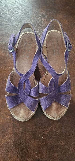 Sandalias de cuña de la firma Pablo Ochoa. Muy estilosas y cómodas. - Número 36. - De ante en color morado y plantilla de piel. - Altura de la cuña 8 cm con plataforma de 2,5 cm. - Están en perfecto estado, solo una puesta.
