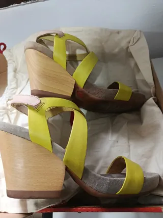 Sandalias de cuña con un diseño moderno y llamativo. - Tiras en color verde lima. - Detalle de tira en color beige. - Plataforma de cuña en madera. - En su caja original y bolsa de la marca para viajar o guardar. Súper originales y muy cómodas. Me las quito porque me han operado de la espalda y no puedo llevar tacón. Una lástima porque son comodísimas y es como llevar una obra de arte en tus pies!!!