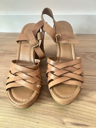 Sandalias de cuña de la marca Sfera en color marrón camel, talla 36. Ideales para verano. - Diseño de tiras entrelazadas. - Suela de corcho. - Cierre de hebilla en el tobillo. Solo usadas un 2 veces