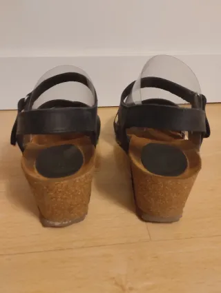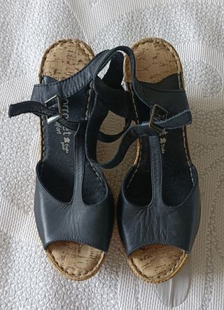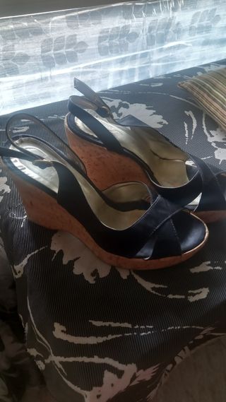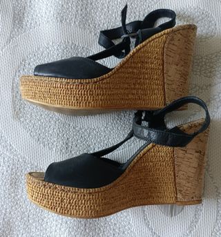Sandalias con cuña de corcho. No pesan nada y son muy cómodas a pesar del tacón alto. Muy buen estado.