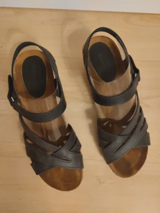 Sandalias de piel estilo griego (compradas en Atenas) en color negro. Cuña de corcho de 4,5cm. Talla 36. Nuevas! #zarawomen #massimodutti #mangowoman #gioseppofemme #greekstyle #greeksandals #makistrokis #cuchy