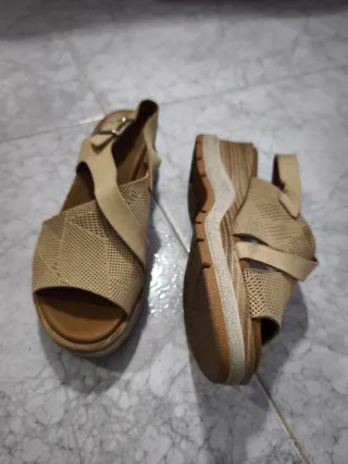 Se venden sandalias de cuña de mujer, muy cómodas y combinan con vestidos y bermudas. Tienen 2 pequeñas manchitas en la parte interna de la sandalia, qye apenas se ven.