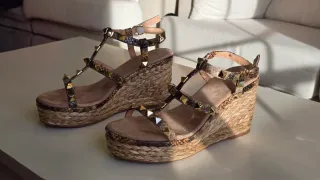 Elegantes sandalias de cuña con un diseño atrevido. - Tiras con tachas doradas. - Acabado tipo piel de serpiente. - Cuña de esparto. Usadas 3 o veces. Se venden por no usar por que a mi madre le parecen demasiado altas y tiene la rodilla operada.