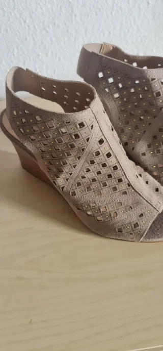 Sandalias de cuña con un diseño abierto y detalles de tachuelas doradas. Perfectas para añadir un toque elegante a cualquier atuendo. - Material: ante sintético. - Color: beige con detalles dorados. - Diseño con perforaciones cuadradas. - Punta abierta. - Cierre trasero.