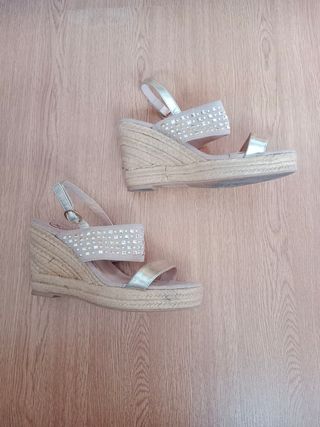 Sandalias de mujer n*39 en color dorado con cuña de esparto y adorno de tachuelas en tonos dorados Puestas en muy pocas ocasiones y en buen estado
