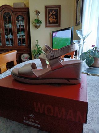 Sandalias Fluchos de mujer, color dorado. Ideales para el verano. Son elegantes y cómodas. - Cuña cómoda y estable. - Diseño de tiras finas. - Material de alta calidad.