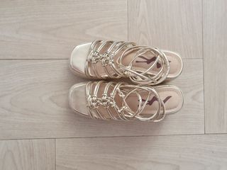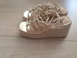 Sandalias de cuña alta doradas. Pone talla 37 pero son 36 (yo uso 35-36 y me van perfectas). Tienen poco uso o ninguno; no recuerdo habérmelas puesto, solo probarla en casa