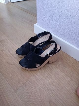 Sandalias de Mango, cuñas de ante negro en talla 39. Son muy cómodas y ligeras. Puestas 2 veces y están muy bien cuidadas. Se entregan en su caja original.