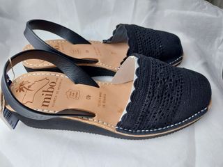 Abarcas menorquinas de la marca Mibo, Talla 40, ideales para el día a día o fiestas. Estilo Ibiza. Cuña. Negro. Nuevo. Sin estrenar - Combinación de encaje y piel. - Diseño abierto en la punta. - Tira trasera para mayor sujeción. - Diseño artesanal hecho a mano en Menorca.
