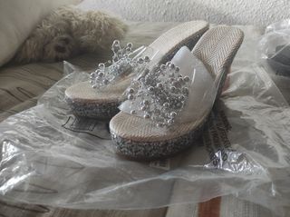 Preciosas sandalias de cuña plateadas, ideales para ocasiones especiales. Son dos sandalias y lucen en perfecto estado. - Diseño elegante con detalles brillantes. - Suela de esparto. - Cierre de hebilla. NO REBAJO NO ENVIO solo entrega en mano Madrid