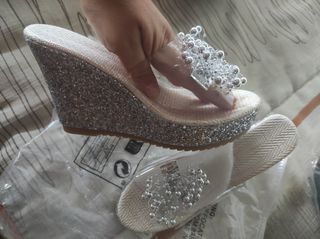 Preciosas sandalias de cuña plateadas, ideales para ocasiones especiales. ✨ - Diseño elegante y sofisticado. - Cuña cómoda y estable. - Decoradas con brillantes detalles plateados.