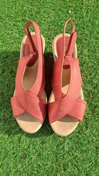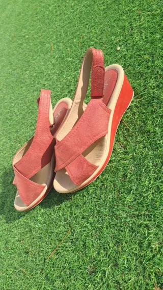 Sandalias rojas con cuña, número 39. No son de mi estilo así que las he usado muy poco. Son muy cómodas y fresquitas. Bien combinadas son muy elegantes.