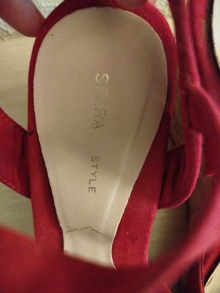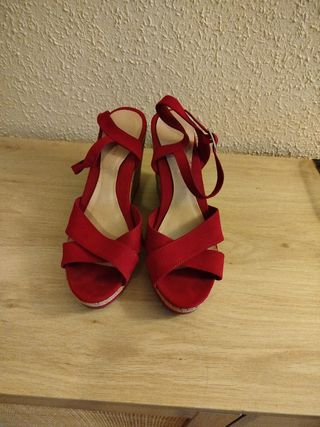 Sandalias rojas con cuña, número 39. No son de mi estilo así que las he usado muy poco. Son muy cómodas y fresquitas. Bien combinadas son muy elegantes.