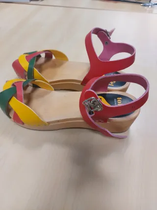 Sandalias de madera con tiras de cuero en varios colores. - Diseño de tiras entrelazadas en rojo, amarillo y verde. - Hebilla metálica ajustable en la correa. - Suela de madera con cuña. - Detalle de logo en la plantilla.