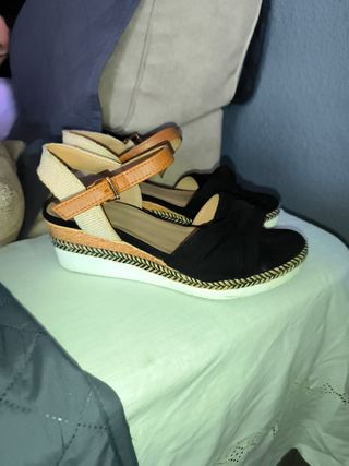 Sandalias de cuña en color negro y marrón. Son ideales para el verano. - Diseño cómodo y elegante. - Perfectas para cualquier ocasión. - Se encuentran en buen estado.