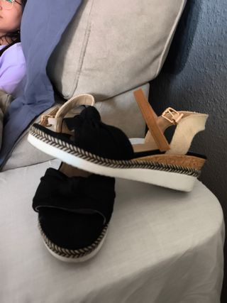 Sandalias tipo cuña de Pull&Bear en talla 39. Son de piel sintética. Usadas pero bien cuidadas. Tienen un pequeño desperfecto en la zona de la hebilla (adjunto foto)