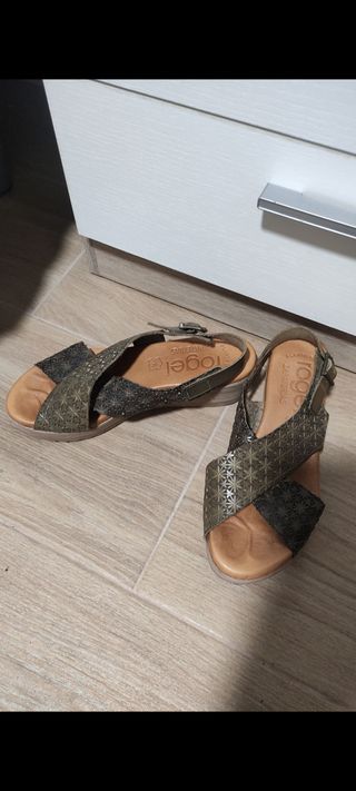 Sandalias de cuña de la marca MARYPAZ, en color mostaza y talla 41. Son de ante, con cierre de cremallera y hebilla. Ideales para verano. Están nuevas. Un solo uso. - Suela de cuña. - Hebilla ajustable. - Cierre con cremallera.