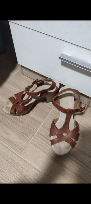 Sandalias de cuña Sandalias de cuña usadas. Son del número 37 y tienen una altura de casi 10 cenntimetros. Son cruzadas por delante y tambien para abrocharse como se puede comprobar en las fotografias. Son acharoladas imitando leopardo