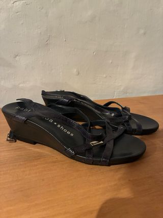 Sandalias de cuña en azul marino. - Diseño de tiras cruzadas. - Suela de cuña. - Material de cuero. Están usadas pero en perfecto estado y son muy comodas