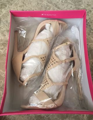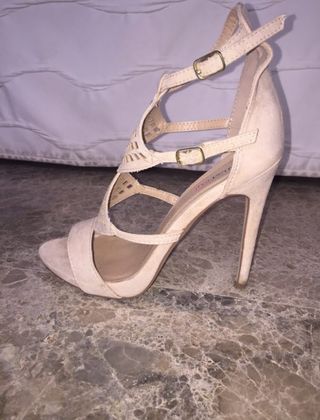 Sandalias de tacón en color beige. Se atan con dos hebillas al tobillo. Tacón de 12 cm. Puestas una vez. A pesar de tener las marcas de los dedos me las he puesto solo una vez (salen porque es ante). Las vendo porque me están grandes.