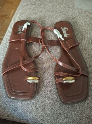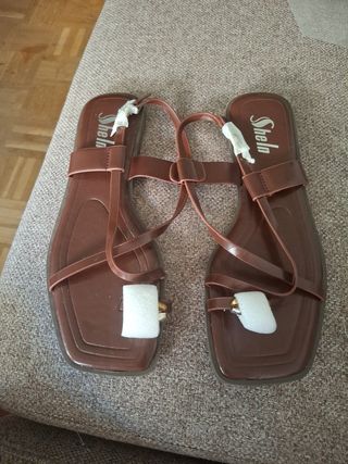 Sandalias planas de tiras en color marrón. - Diseño con tira para el dedo. - Detalle metálico en la tira. - Suela cómoda.