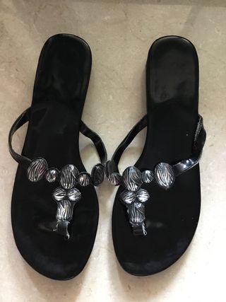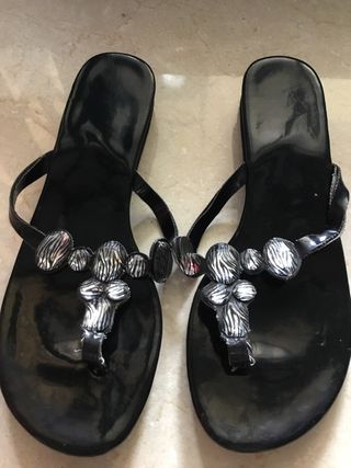 Chanclas cómodas con un diseño elegante. - Tira con detalle de pedrería. - Suela de goma. - Diseño tipo cuña. - Algún desperfecto.