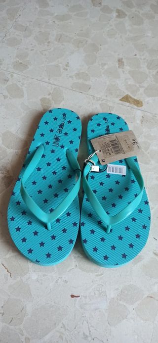 Vendo un par de chanclas de playa nuevas. Son azules y rosas, con un diseño a cuadros. Las chanclas tienen la marca T.P.T grabada en la suela. Se ven muy bonitas y parecen cómodas.