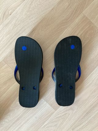 Sandalias Havaianas, talla 35/6, color azul. Son dos chanclas, con un diseño brillante. Están en buen estado, aunque presentan algunas marcas de uso en las suelas. - Cómodas y ligeras. - Perfectas para el verano.