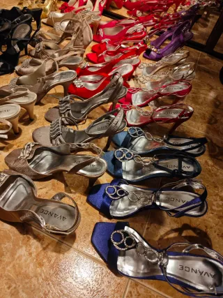 Lote de 19 pares de sandalias de fiesta nuevas y preciosas, marca Avance. Dos pares son de la marca Menbur - Todas son de la talla 37 - Tienen un diseño elegante y sofisticado - Diseños varios y variedad de estilos y colores para complementar tus atuendos - Tacones de diferentes alturas, entre 7 a 8 cm. - Adornos con pedrería y detalles. - Materiales diversos como tela, piel y sintéticos. - Son todos una preciosidad y están completamente nuevos