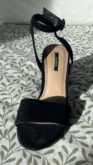 Elegantes sandalias de fiesta de Bimba y Lola. - Diseño con tiras en contraste. - Tacón fino y pulsera al tobillo. - Acabado en ante y detalles metalizados.