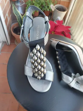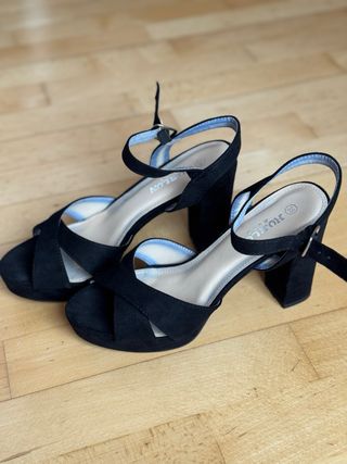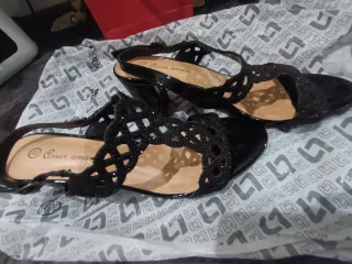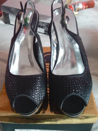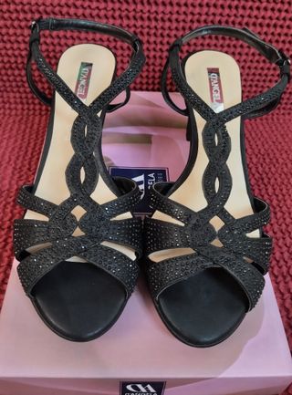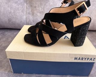 Sandalias con cierre ajustable y tacón de lentejuelas negras. Súper cómodas y estables. Puestas en dos ocasiones. Se entregan en su caja. Precio en tienda 39€.