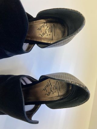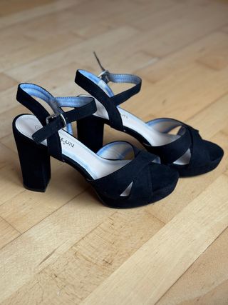 Bonitas sandalias de tacón y plataforma Marypaz en n° 38, perfectas para eventos o fiestas. - Textif efects antelina color negro. - Diseño con tiras cruzadas en la pala. - Plataforma delantera. - Cierre con pulsera al tobillo y hebilla. - Tacón grueso y alto. - Altura tacón 12 cm. ✨ En buen estado general. ⚠️ En la sandalia izquierda en plantilla interior ligero roce, es solo estético que no se ve una vez puestas en el pie. Se ve en foto. Calzado moda actual atemporal tendencia chic fashion moderna bonito barato oferta oportunidad outlet ocasión liquidación marca