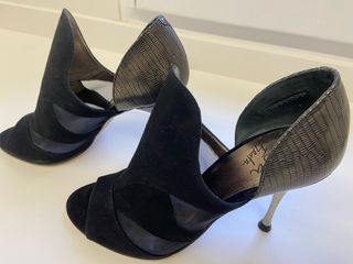 Elegantes zapatos de tacón alto con plataforma y tira al talón. - Material exterior: Piel. - Color: Negro. - Tacón de aguja. - Punta abierta. Tacón de 9cm de alto y plataforma de 2cm. Usado 1vez.
