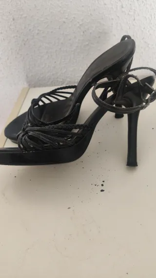 Elegantes sandalias de fiesta con un diseño delicado. Número 37. Usadas solo una vez - Tiras finas negras. - Detalle de pedrería en la pala. - Tacón fino.