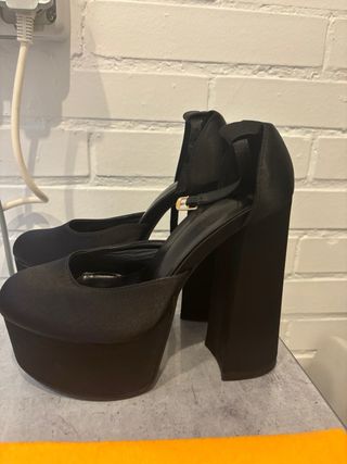 Elegantes zapatos de plataforma con un diseño moderno y atrevido. - Acabado en satén. - Tacón grueso y alto. - Tira al tobillo con hebilla dorada. - Precio NO negociable - Envio rápido para que te llegue a tiempo para las fiestas 💫