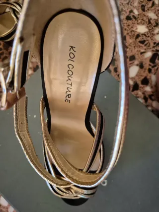 Sandalias fiesta tacón Koi Couture negro/dorado.