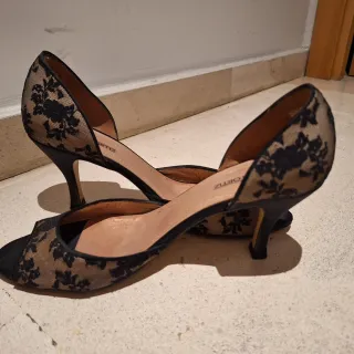 Elegantes zapatos de fiesta con un delicado diseño de encaje. - Acabado en encaje floral negro. - Base en tono beige. - Tacón fino.